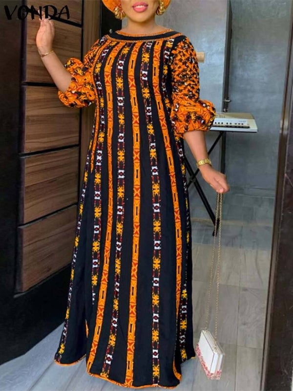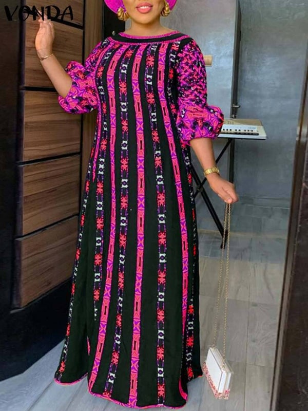 VONDA Plus Size Autumn Women Long Maxi Sundress O Neck Printed