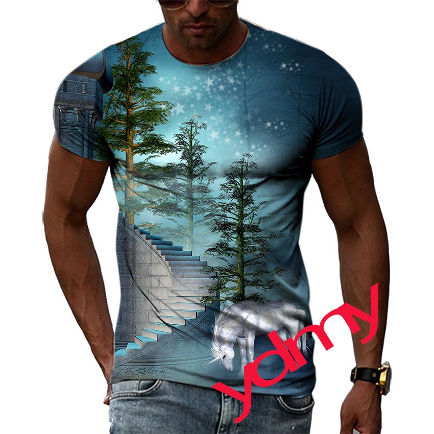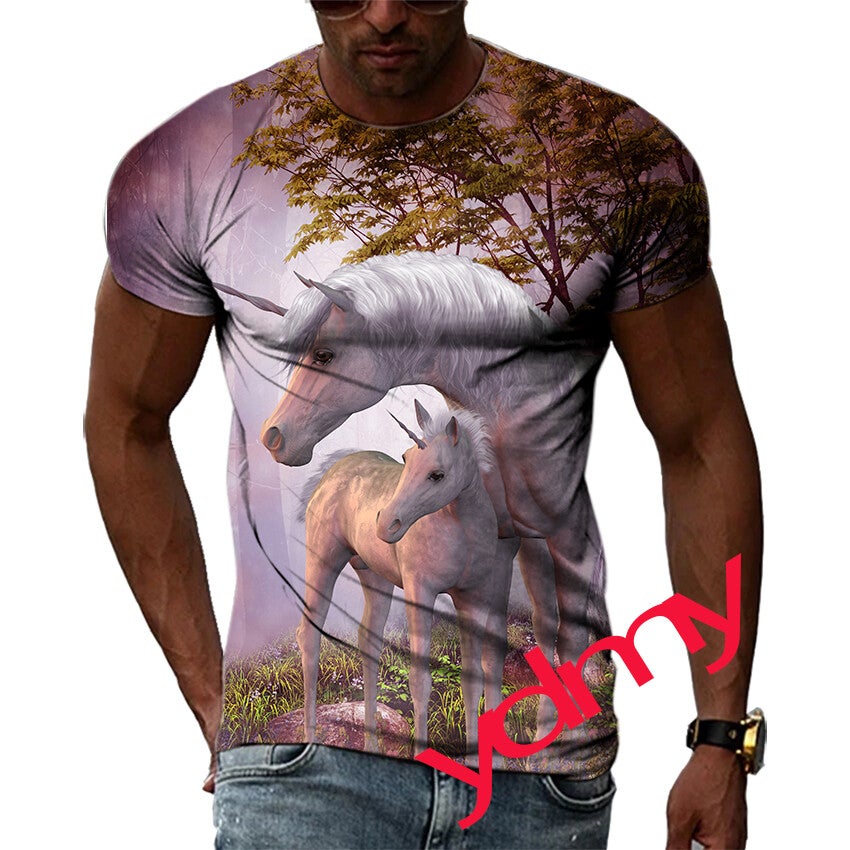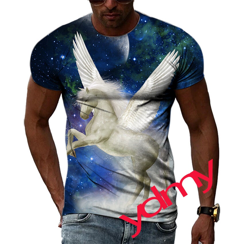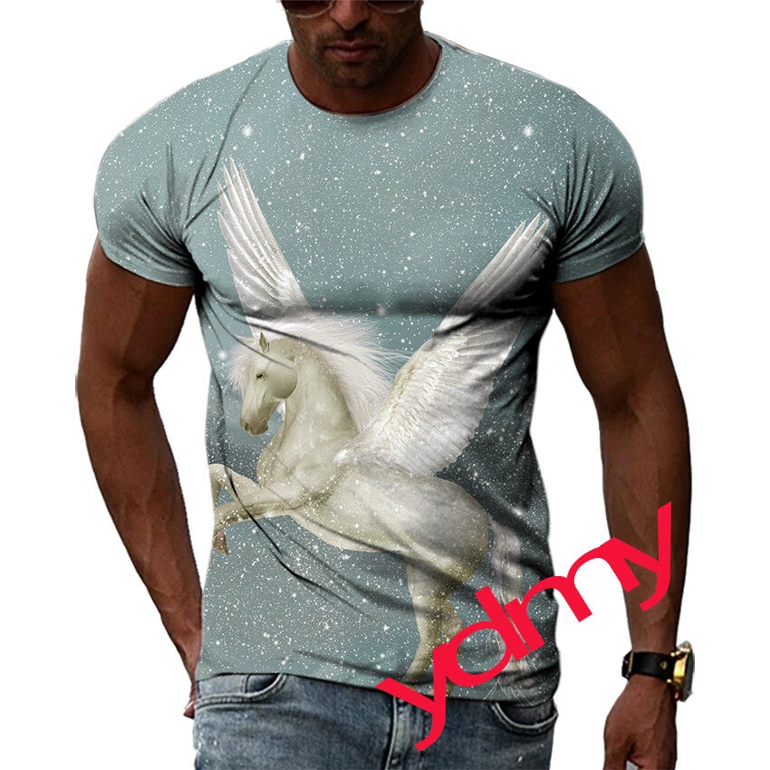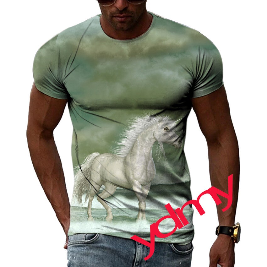 Tide Fashion Summer Magic White Horse Picture Men's T-shirt Casual Print Tees Hip Hop Personality Round Neck Short Sleev Tops