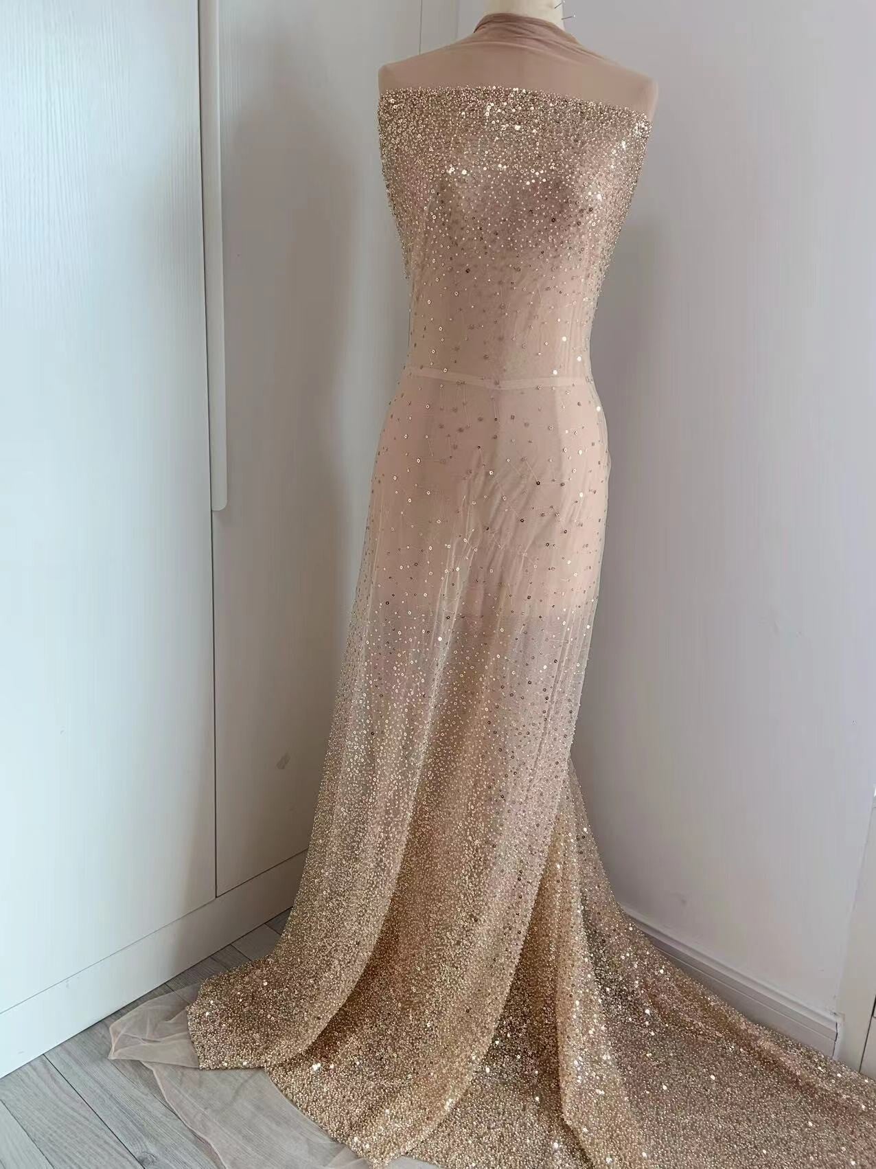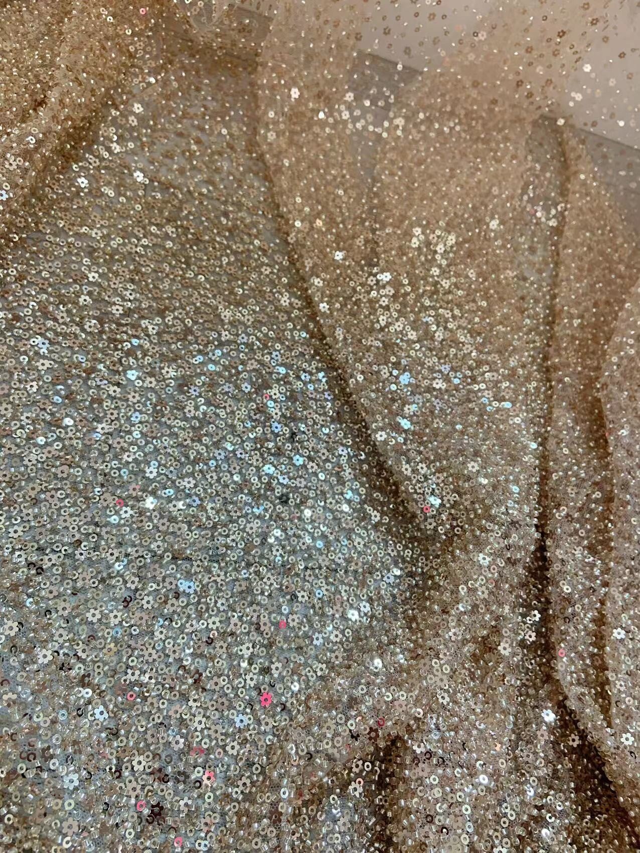 1 Yard Flower Sequins Beaded Rose Gold Tulle Lace Fabric for Wedding Dress,Sparkle Dance Costume,Evening Party Skirt,Ball Gown.