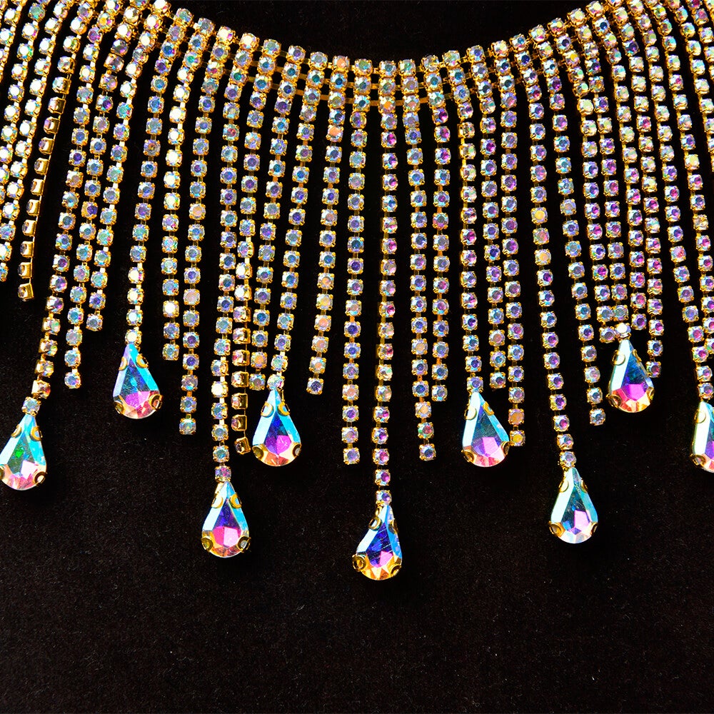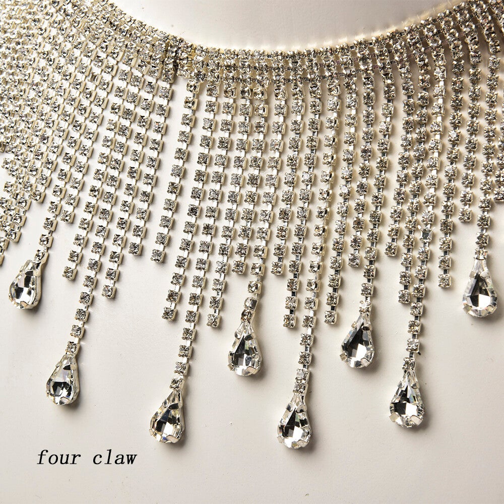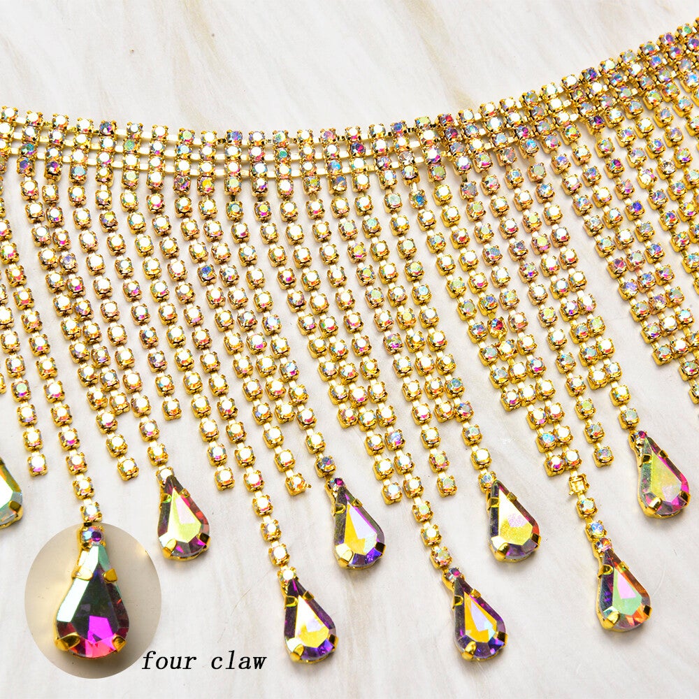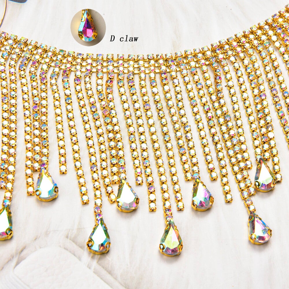 Glitter Glass Rhinestone Trim Water Drop Chain Tassel Fringe Metal