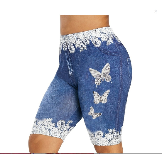 Plus Size Denim Shorts Women Lace Patchwork Butterfly Print Bodycon